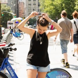 I’m all over it. I soon discovered that in addition to being my favored form of public transportation, riding a Citi Bike (or any bike) is also the perfect opportunity for a low-maintenance beauty person like myself to fake the look of “doing my hair.”